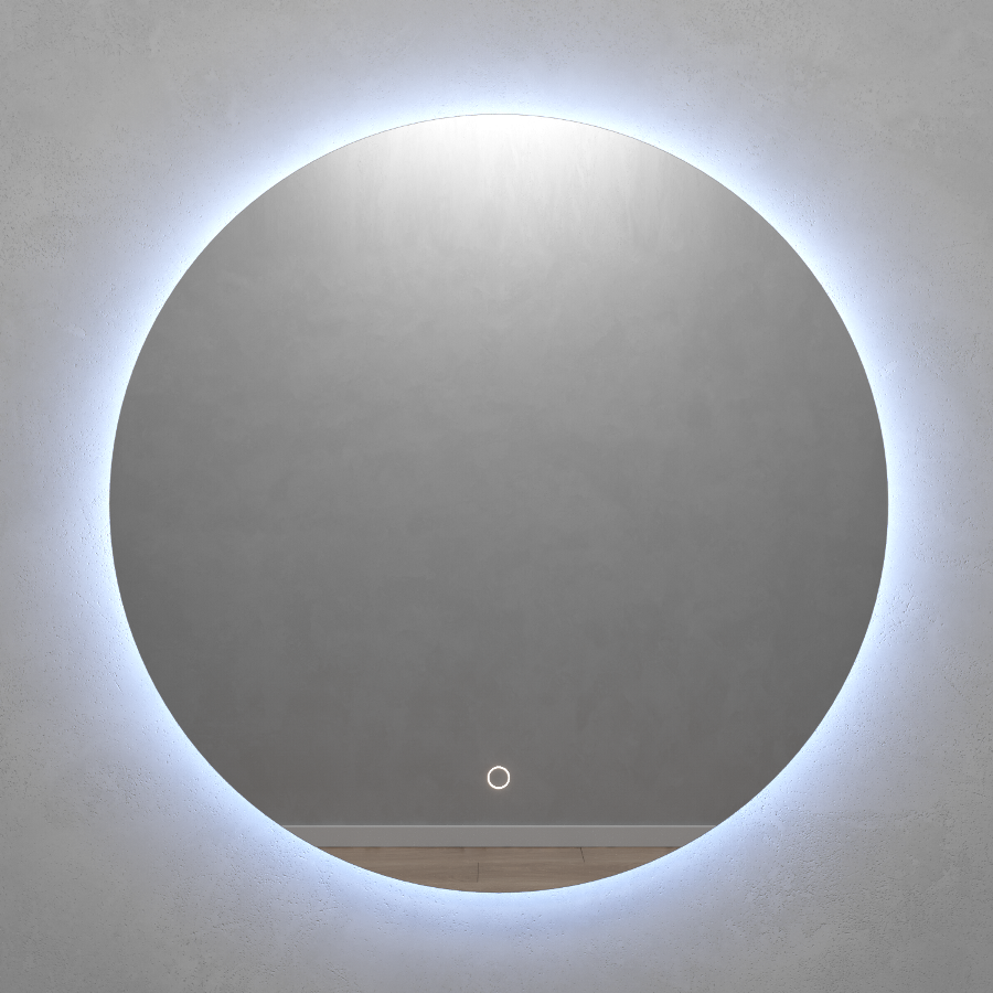 Безрамное зеркало круглой формы с контурной (тыльной) холодной подсветкой, свет 6000К. Подложка из высококачественного МДФ, светодиодная лента защищена матовым свето-рассеивателем от попадания пыли и влаги. Есть вывод 220W для подключения к сети, включение подсветки от сенсорной кнопки на зеркале.